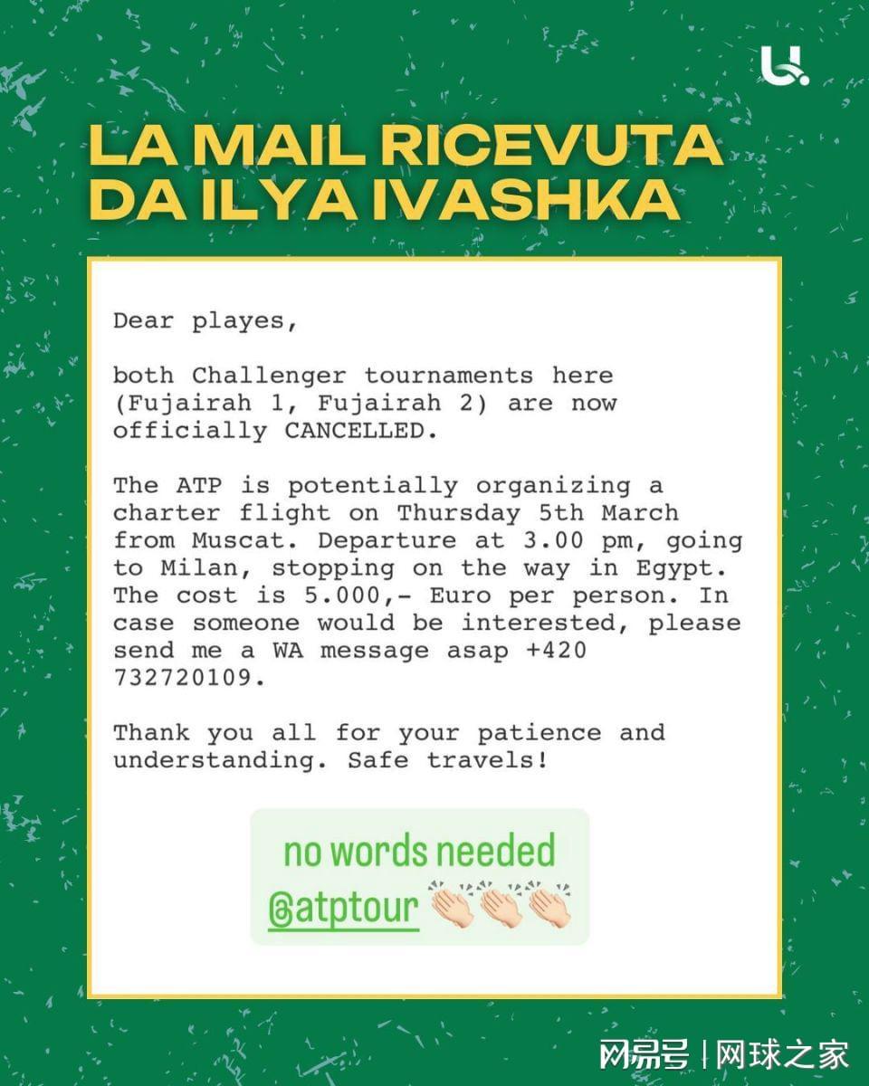 很快媒体报道,ATP为了准备让被困的球员和相关随行人员离开阿联酋,准备包机从“从马斯喀特起飞,经停埃及后前往米兰”,带离所有人安全离开中东。